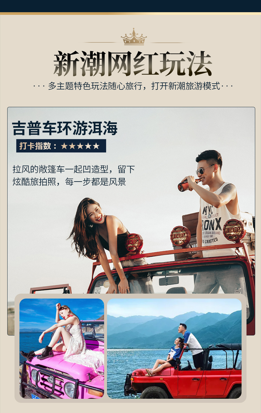 早餐后乘前往大理,車程約2.5小時,乘坐【洱海特色游船】(游覽時間約30分鐘)欣賞洱海風光。午餐后乘【敞篷吉普車游洱?!?/strong>(游覽時間約60分鐘)感受被譽為最美環(huán)海路,心花路放,海天一線。欣賞保留完整的石頭路、龍龕碼頭、才村、馬久邑花海旁航拍贈送集體照后邂逅洱海最美地【抖音網(wǎng)紅打卡點】自由活動、海景、網(wǎng)紅道具【網(wǎng)紅玻璃球、白色桌椅】傾心為您定制洱海夢!在敞篷吉普車上放飛青春,拍出不一樣的自己!定格你最難忘的一刻!讓年輕的旅行成為你一輩子的記憶?。‰S后游覽“文獻名邦”—【大理古城】(不含大理古城電瓶車35元/人)大理古城東臨碧波蕩漾的洱海,西倚常年青翠的蒼山,形成了“一水繞蒼山,蒼山抱古城”的城市格局。古城內(nèi)東西走向的護國路,被稱為“洋人街”。晚餐品嘗特色小吃【砂鍋魚】然后入住酒店。