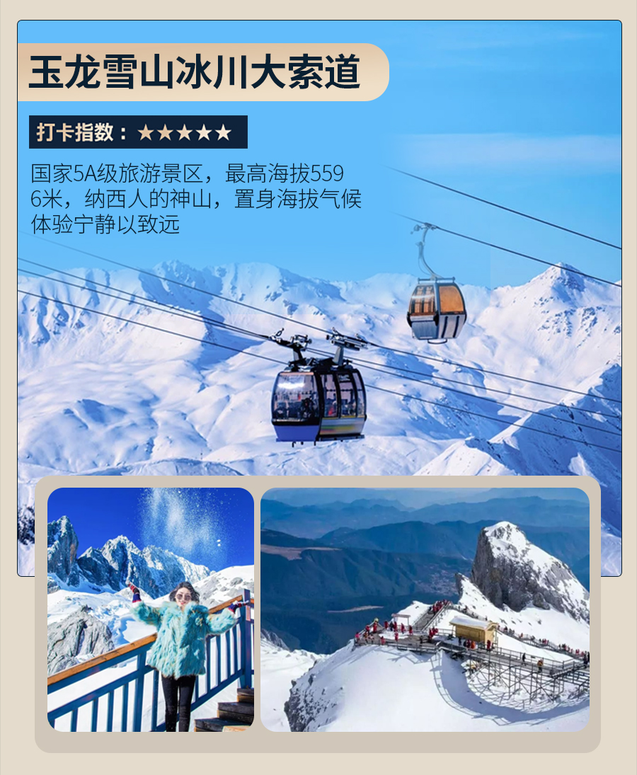 ☆景點升級:麗江特色歌舞表演,冰川大索道。三個AAAAA頂級景區(qū),讓您深度悅游云南!