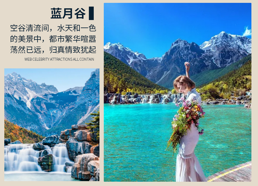 中餐后游覽【玉龍雪山冰川大索道】(玉龍雪山屬稀缺資源,限票上山,如遇不可抗拒因素,改走小索道),并不是高度制約了人類的足跡,而是有些山峰本就不是用來攀登挑戰(zhàn)的。比如北半球溫帶唯一的雪山—玉龍。海拔5596米的玉龍雪山,是納西神三朵的化身。我們?yōu)槟x擇了大索道(可登臨海拔4506米),一路上玉龍雪山的險、奇、美、秀盡收眼底,透過變換莫測的云霧,高大的雪杉、盛放著野花的大草甸若隱若現(xiàn),偶爾跑出來一頭通體白色的牛羊,像極了納西愛情敘事詩《魯般魯饒》開篇提到的“玉龍第三國”。碧空之下,玉龍十三峰晶瑩耀眼,飄渺的云層在山腰為它們披上了一條金甲束腰,腳下踩著軟綿綿的皚皚白雪,豈能一人獨享這自然饋贈,給您的家人和朋友來一場16°的清涼直播,也是盛夏難得的大彩蛋游覽【藍月谷】(不含藍月谷電瓶車60/人),又叫白水河,兩個名字都如此仙氣飄飄、詩情畫意,坐落于巍峨的雪山之下,柔和溫婉,素流交錯,晴時水藍泛綠,雨時潔白無瑕,此等仙蹤秘地,可能也只有神仙眷侶的生活才配得上。乘動車返回昆明。