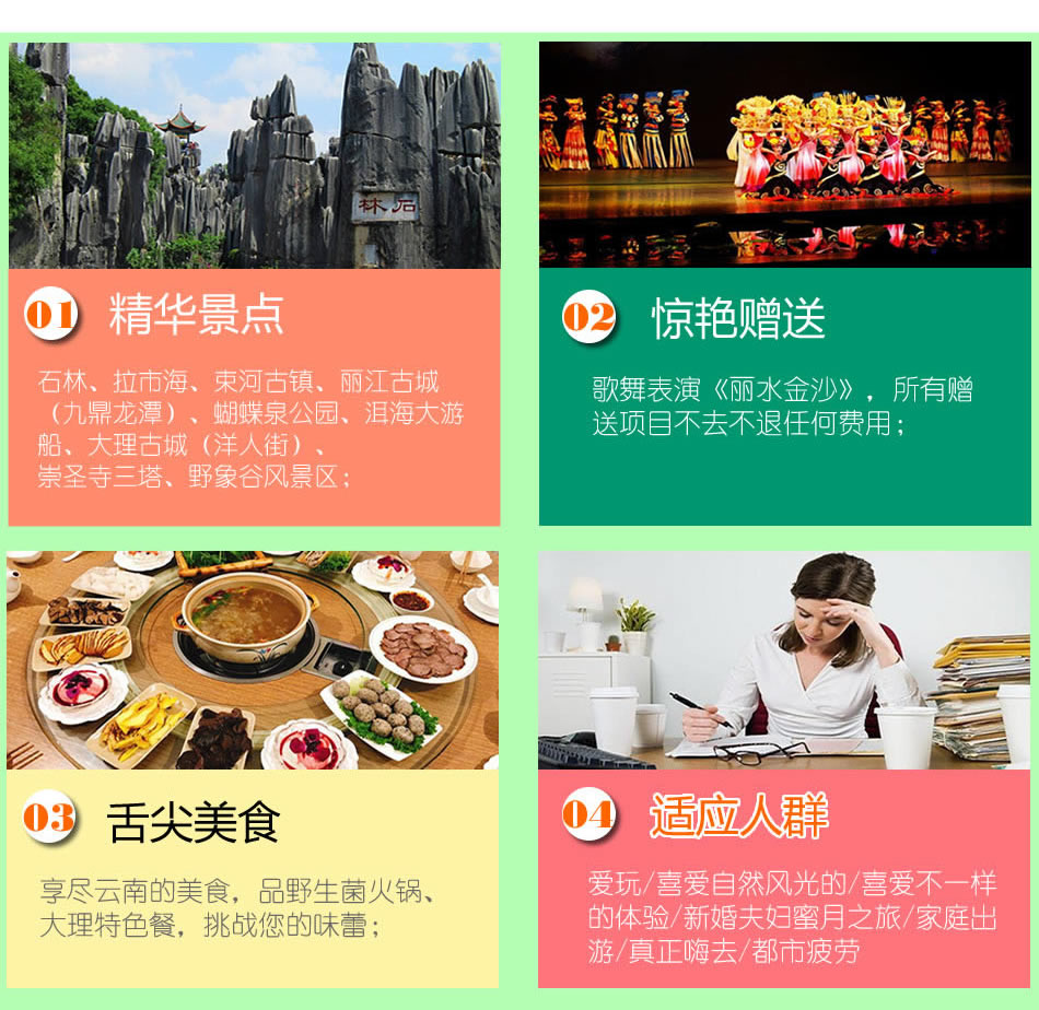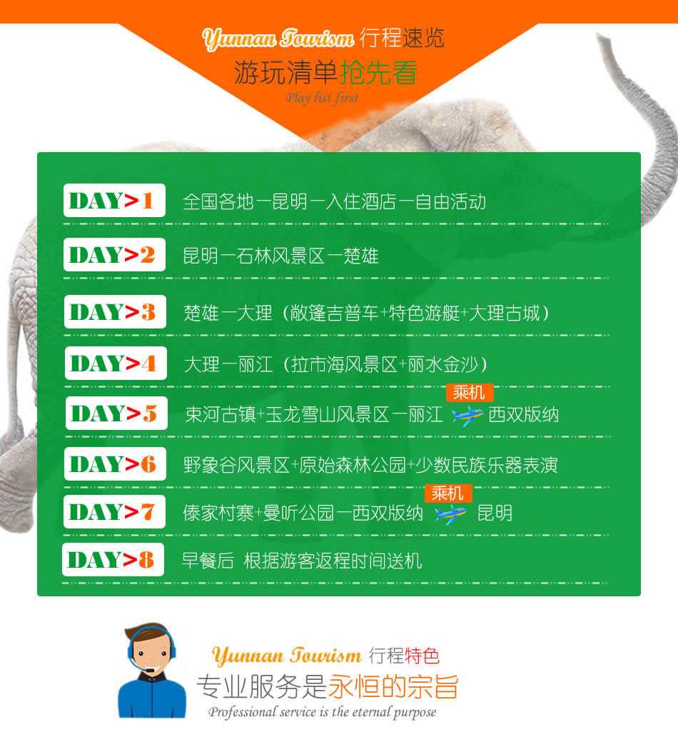 行程中所列景點(diǎn)首道大門(mén)票玉龍雪山 大理古城 洱海雙廊+南詔風(fēng)情島+崇圣市三塔-蝴蝶泉 野象谷-原始森林+曼聽(tīng)公園+中科院植物園+西雙版納總佛寺